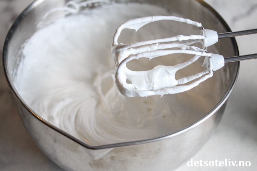 Pisk lenge med elektrisk mikser (ca. 10 minutter) til du får en tykk og stiv marengs.