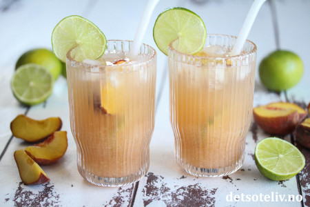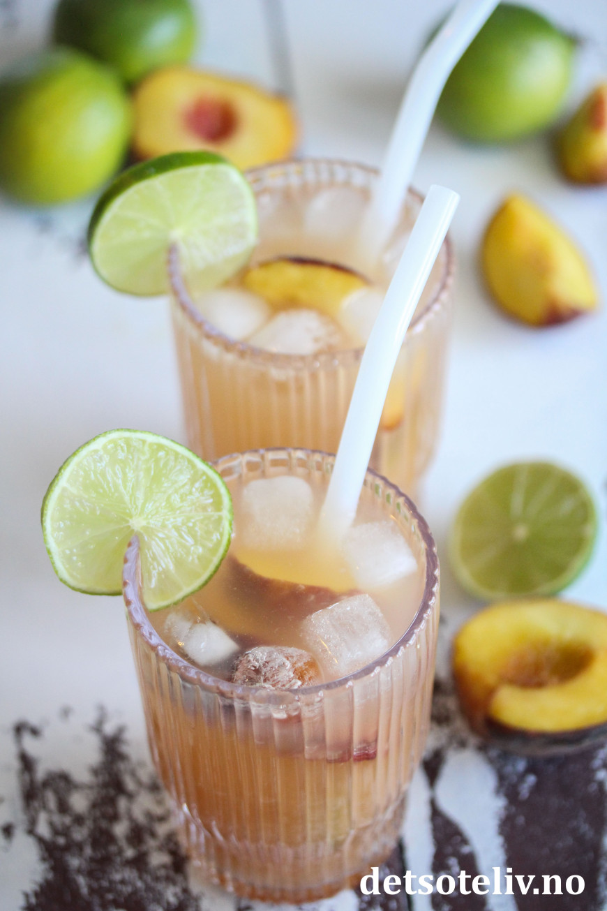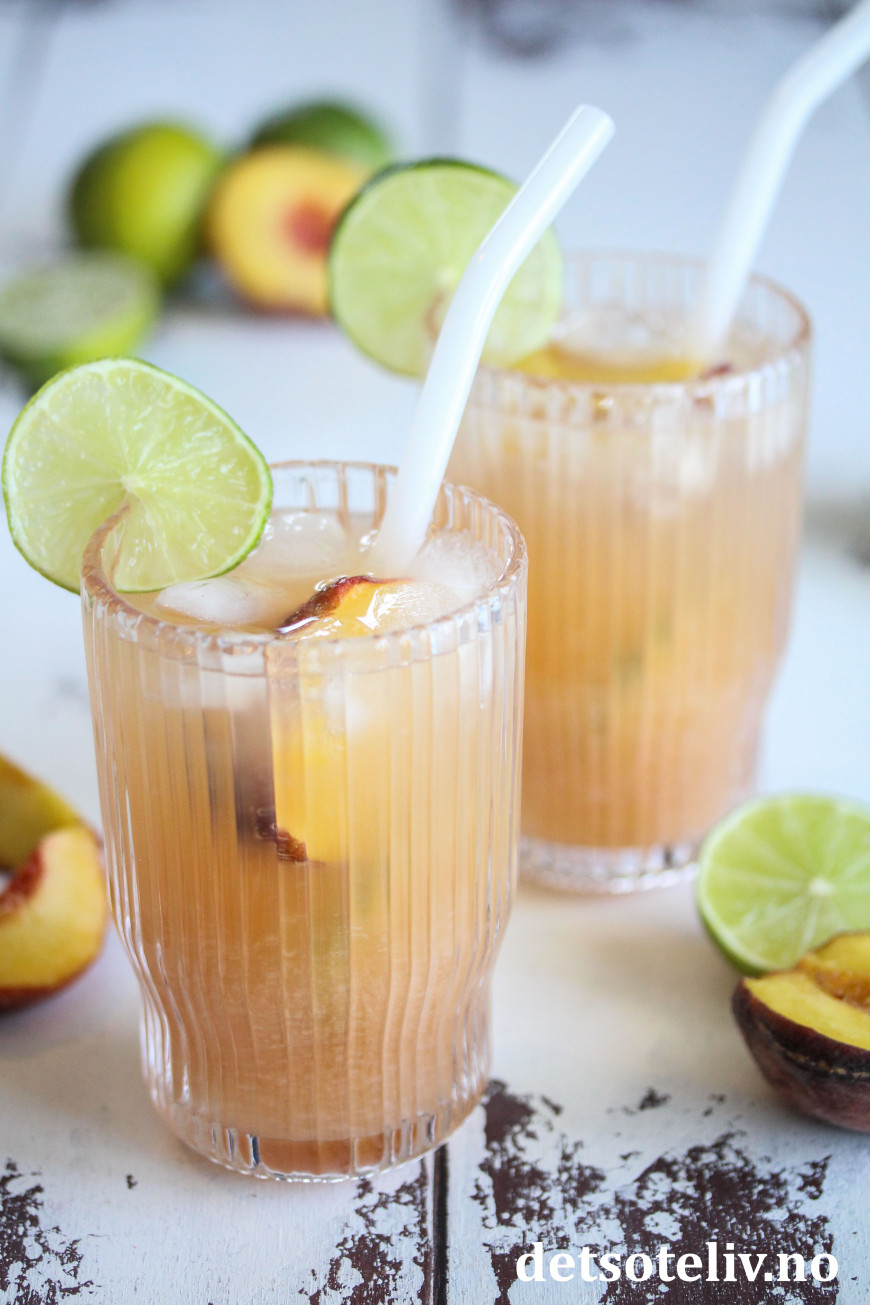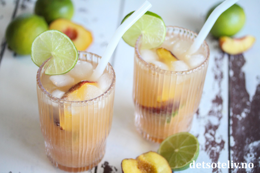 Finn frem to glass og ha isbiter i glassene. Fordel drinken i glassene, fyll opp med farris, og pynt med et par skiver fersken og lime.