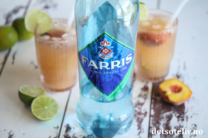 Fordel drinken i glassene, fyll opp med farris, og pynt med et par skiver fersken og lime.