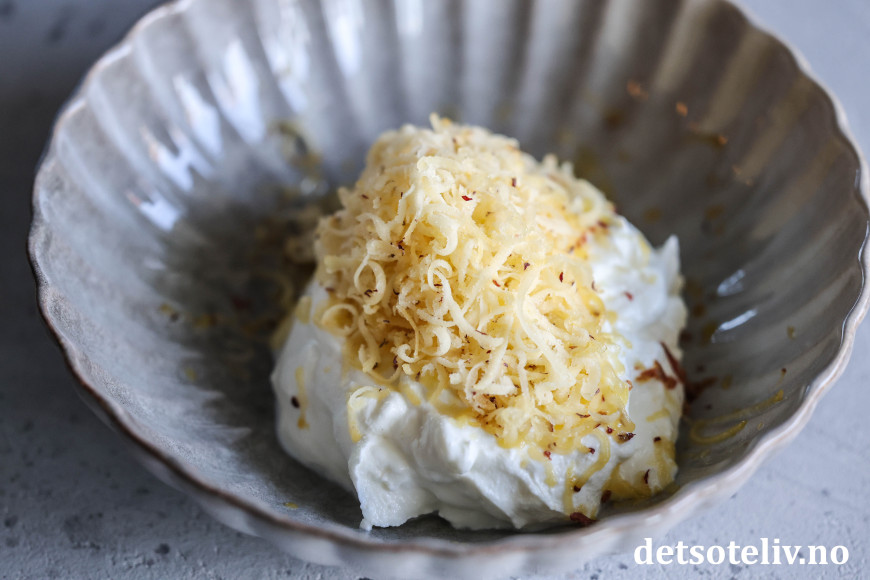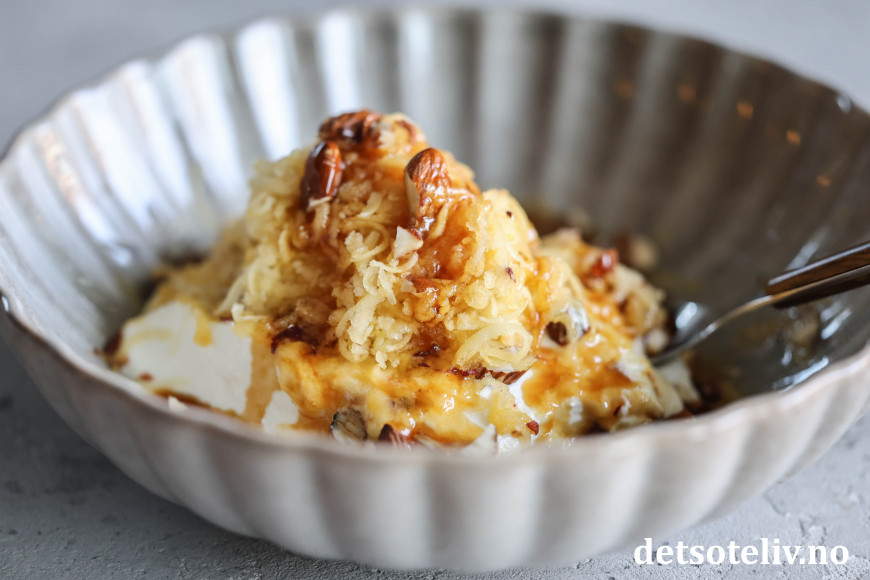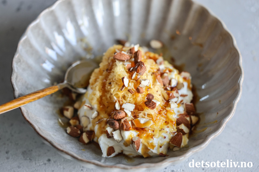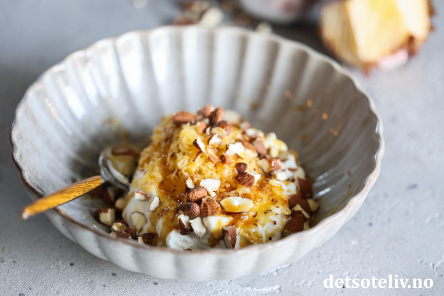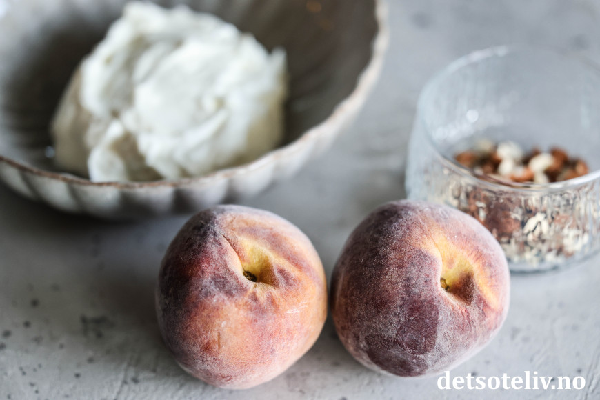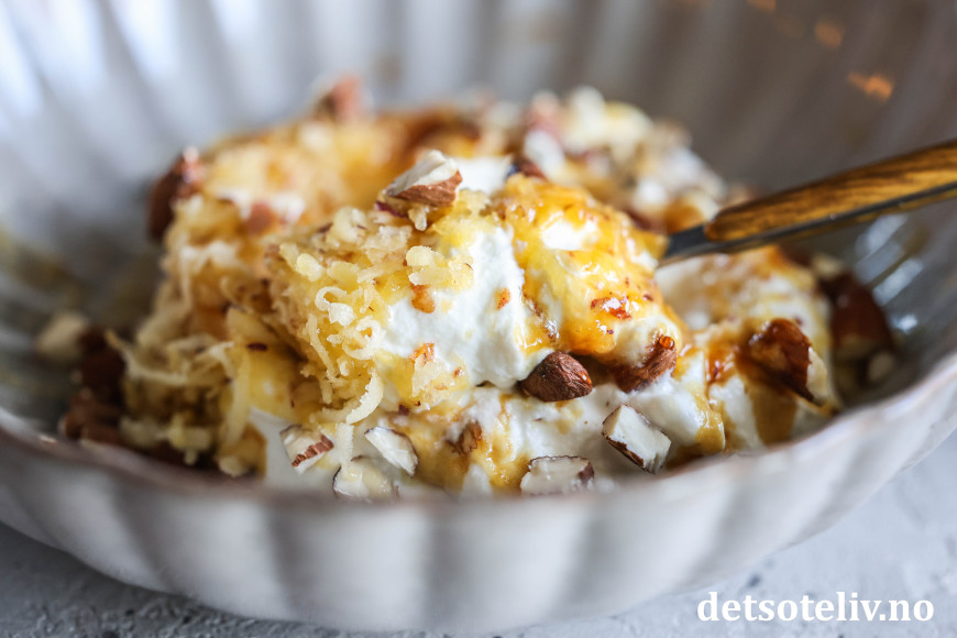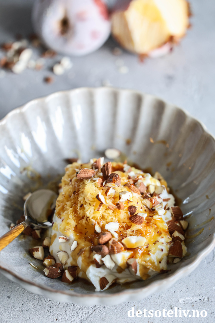 Her har jeg brukt fersken, som jeg har raspet over en skål med gresk yoghurt. Så hadde jeg over hakkede mandler og litt karamellsaus (alternativt kan du bruke flytende honning eller lønnesirup).