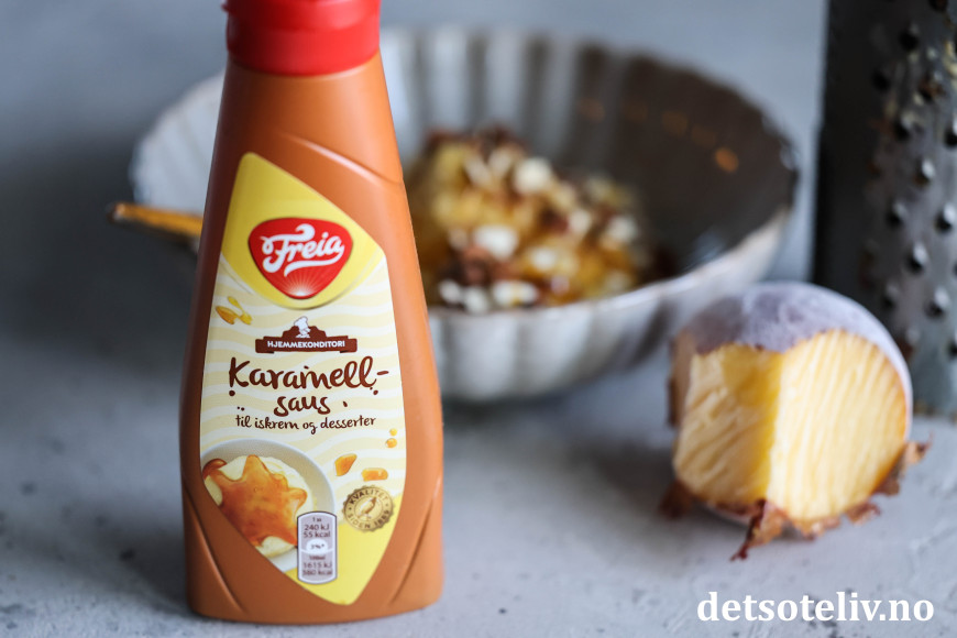 ♥ Jeg har her brukt ferdigkjøpt karamellsaus, som faktisk ble utrolig godt på revet, fryst fersken.