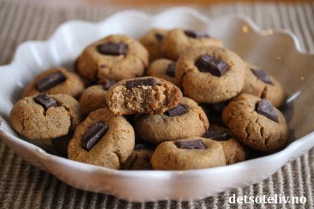 Form deigen til 25 jevnstore kuler. Sett kulene på to stekeplater dekket med bakepapir. Trykk en sjokoladebit i midten på hver kake.