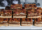 Løft kaken ut av langpannen ved å ta tak i bakepapiret. Skjær kaken i firkanter med en skarp kniv.