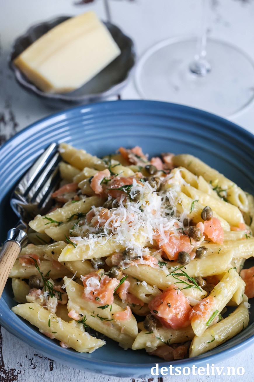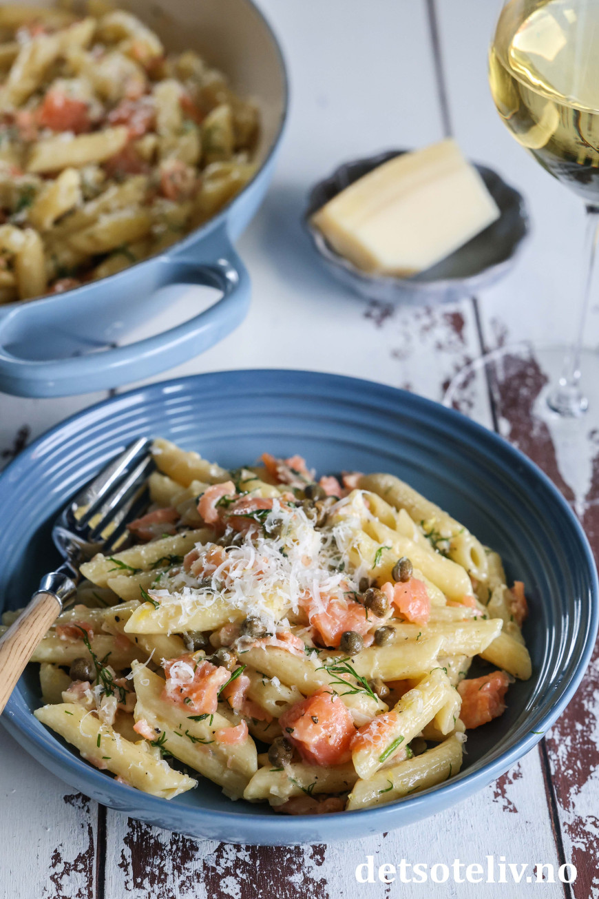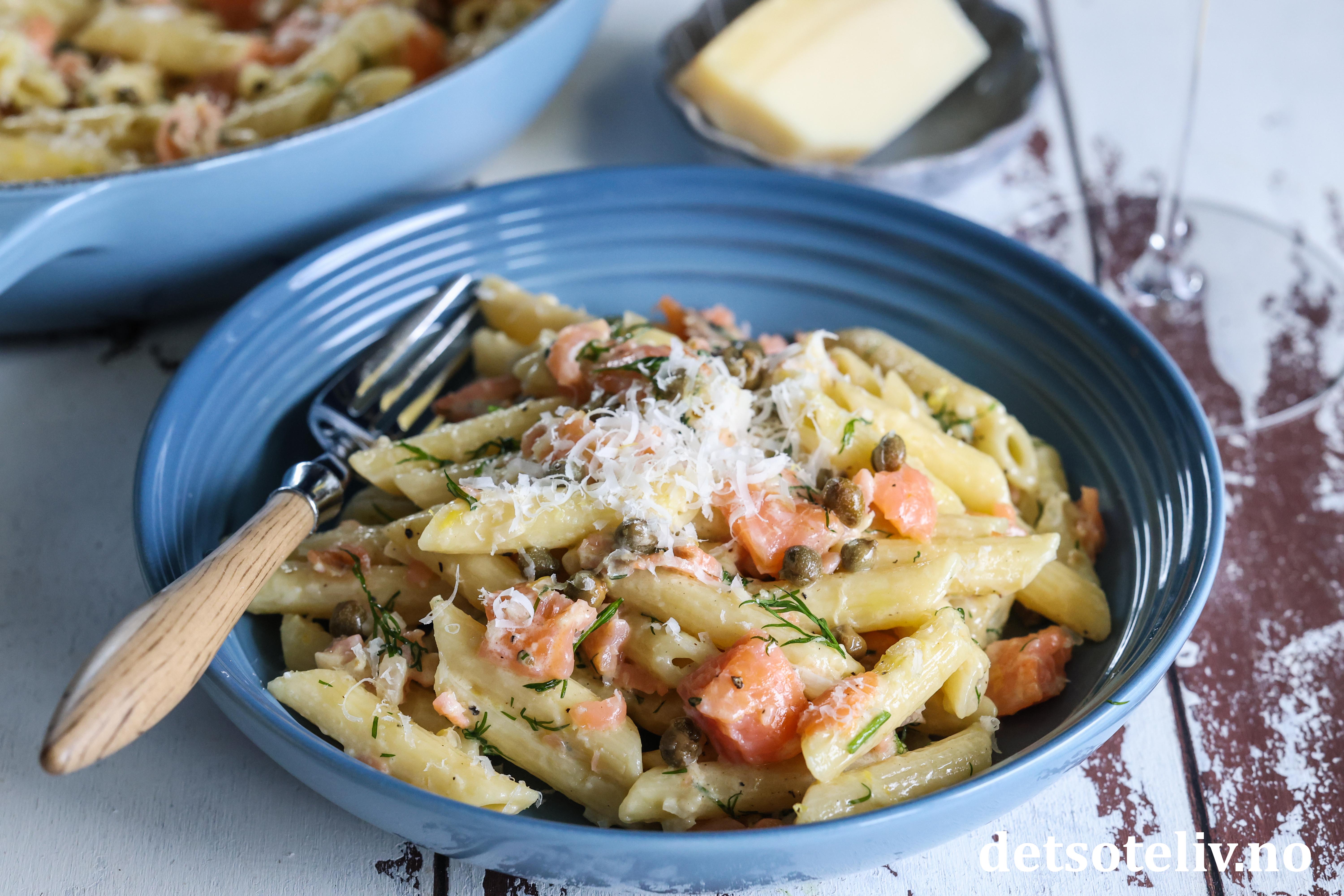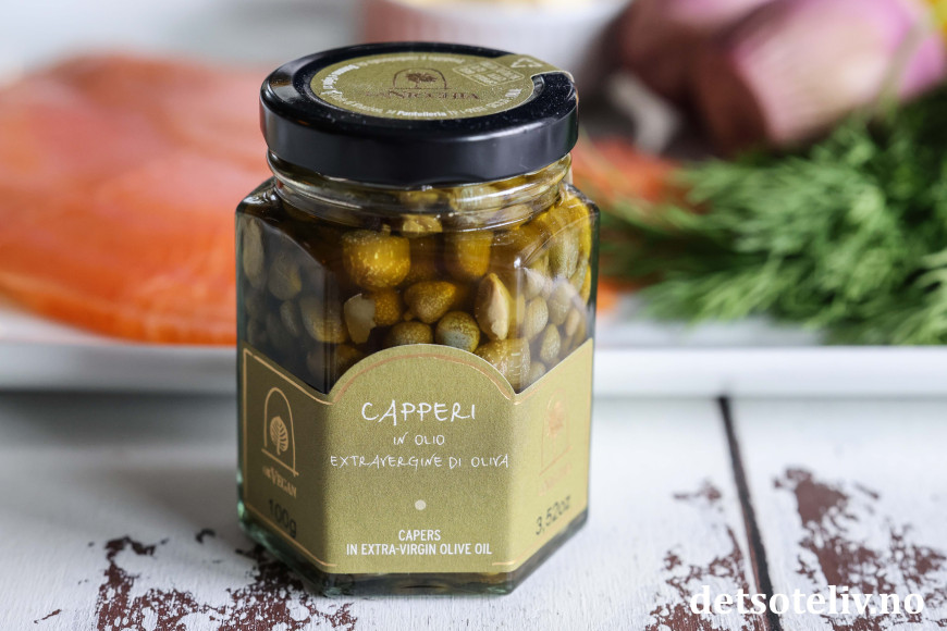♥ Jeg har her brukt kapers i olivenolje, som gir veldig god smak. Får du ikke tak i dette, kan du også bruke kapers i lake, men la de renne godt av seg før du vender dem inn i pastaretten.