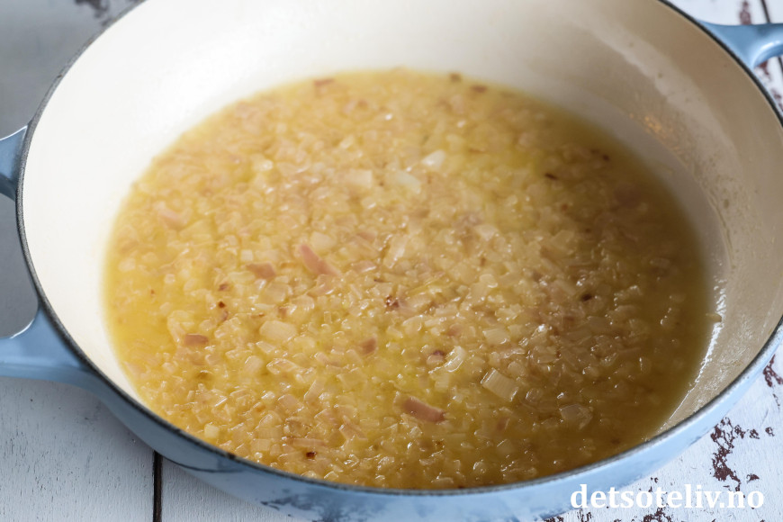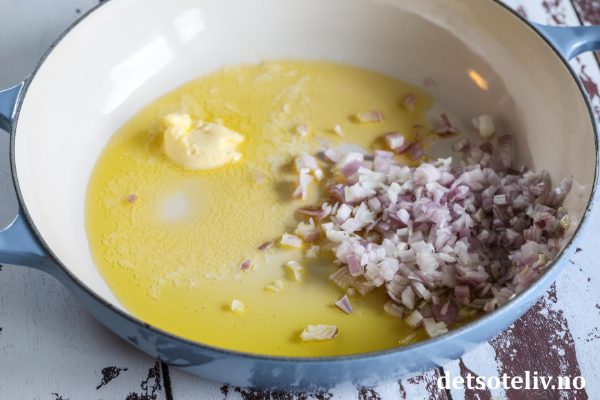 Ha smør og olivenolje i en buffetgryte (eller stor stekepanne). Tilsett fint hakket sjalottløk.