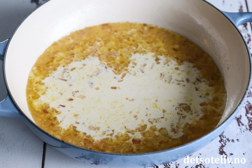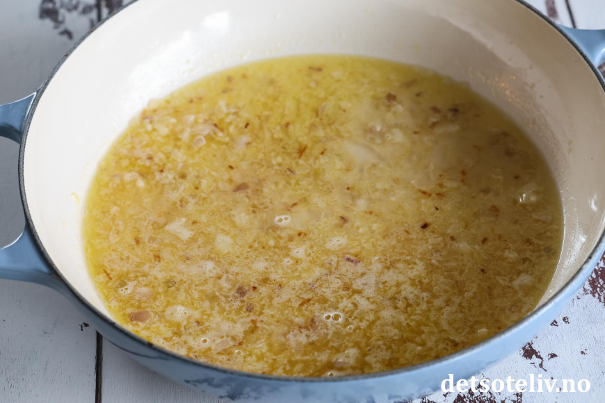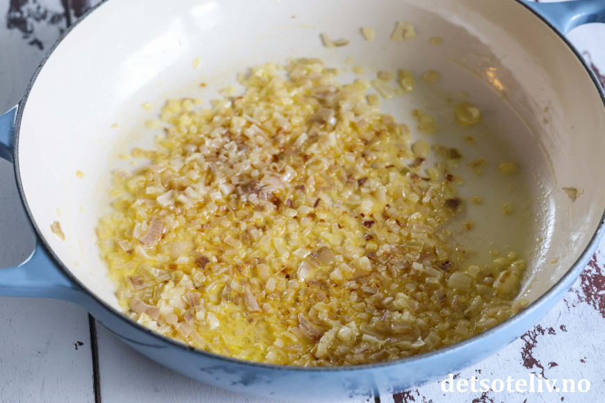 Mens pastaen koker, kan du starte på sausen. Ha smør og olivenolje i en buffetgryte (eller stor stekepanne). Tilsett fint hakket sjalottløk. La løken steke på middels varme i et par minutter til den blir blank og myk.