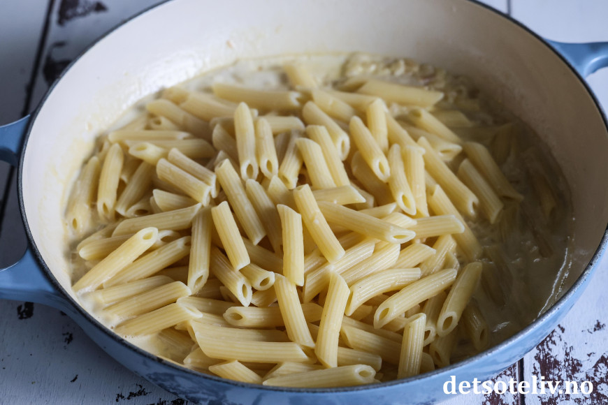 ♥ La pasta koke ferdig i fløtesausen det siste minuttet. Det følger jo av tittelen at det helst skal være penne (pastarør) i denne retten, men smaken blir jo helt den samme selv om du skulle bruke pasta med annen fasong.