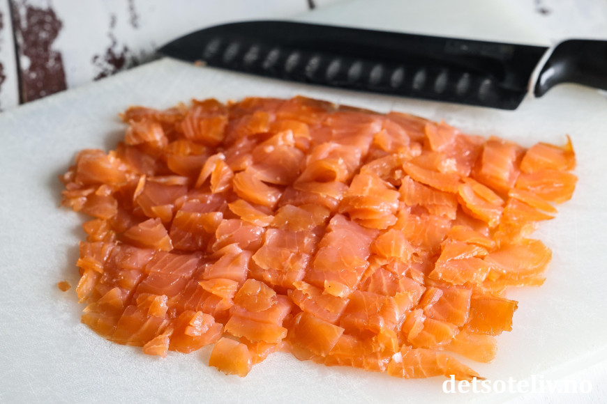 Du kan bruke fersk laks i terninger eller røkelaks (salmone affumicato) som jeg har brukt her.