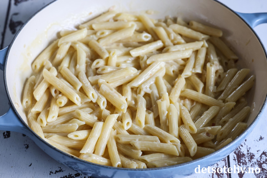 Når pastaen er nesten ferdig kokt, løfter du den over i gryten. Vend om. Tilsett litt av pastavannet (start med ca. 1 dl, og tilpass deretter mengden til du får passe tykkelsen på sausen). La pastaen småkoke i fløtesausen til den er al dente.