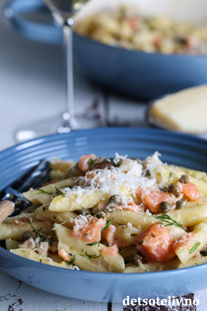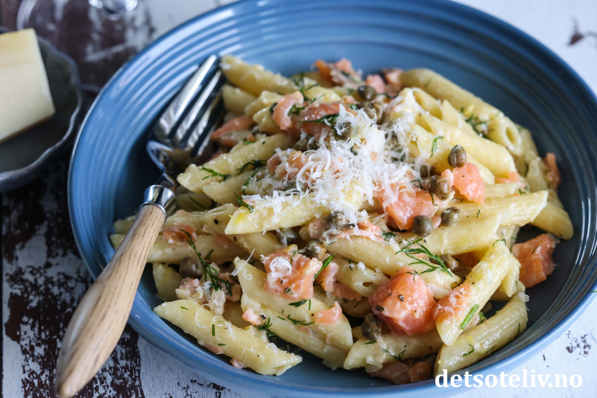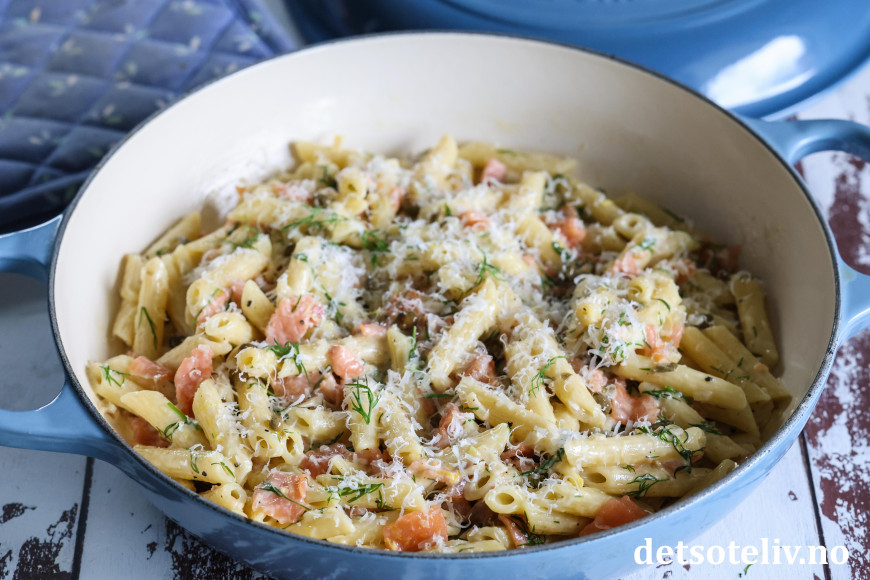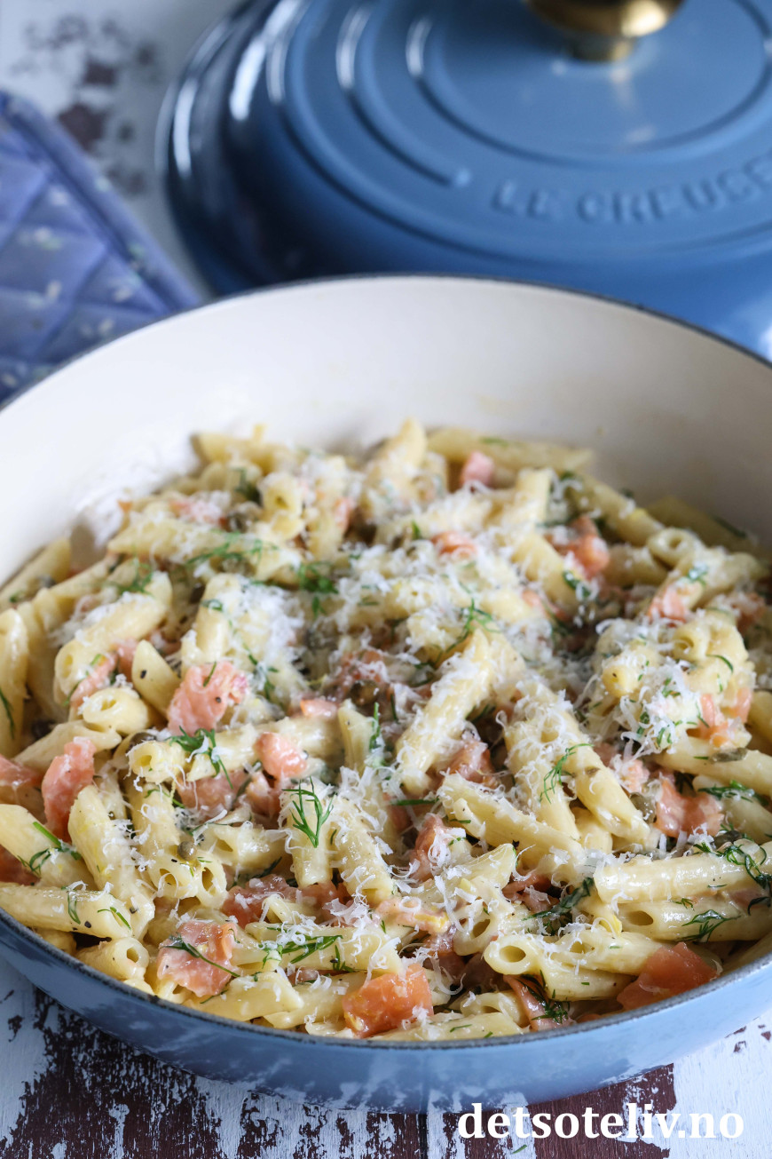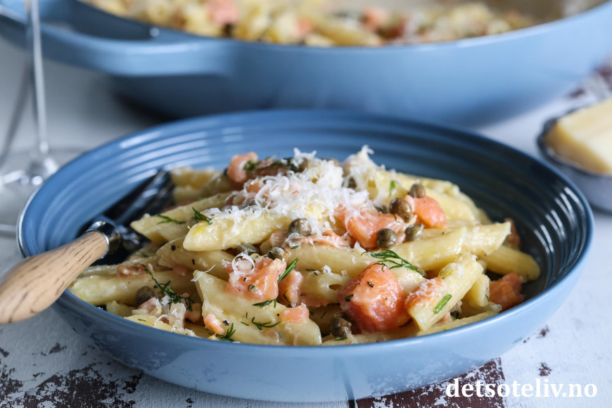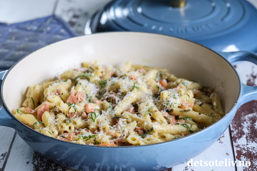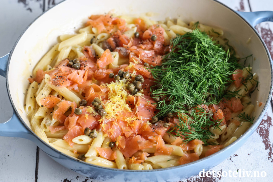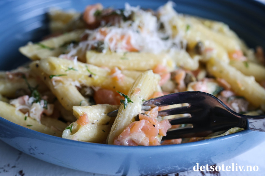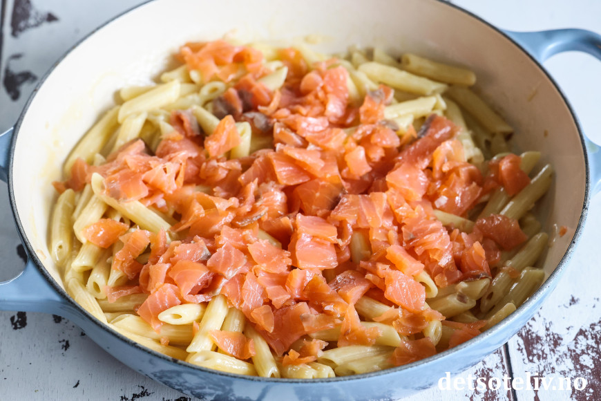 ♥ Det er meningen at gryten skal tas av platen før man vender inn røkelaksbitene. Laksebitene skal altså ikke koke sammen med sausen, men bare bli lett varmet opp ved at de vendes inn i pastaretten helt til slutt.
