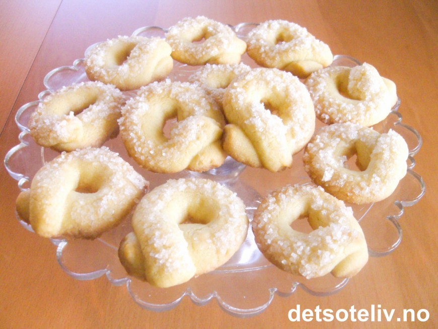 Stek kakene midt i ovnen ved 200°C i ca 10 min. Pass på at kakene ikke blir for mye stekt; de skal bare være lett gyldne. Avkjøl kakene litt på platen før de forsiktig flyttes over på rist med en stekespade og avkjøles helt.