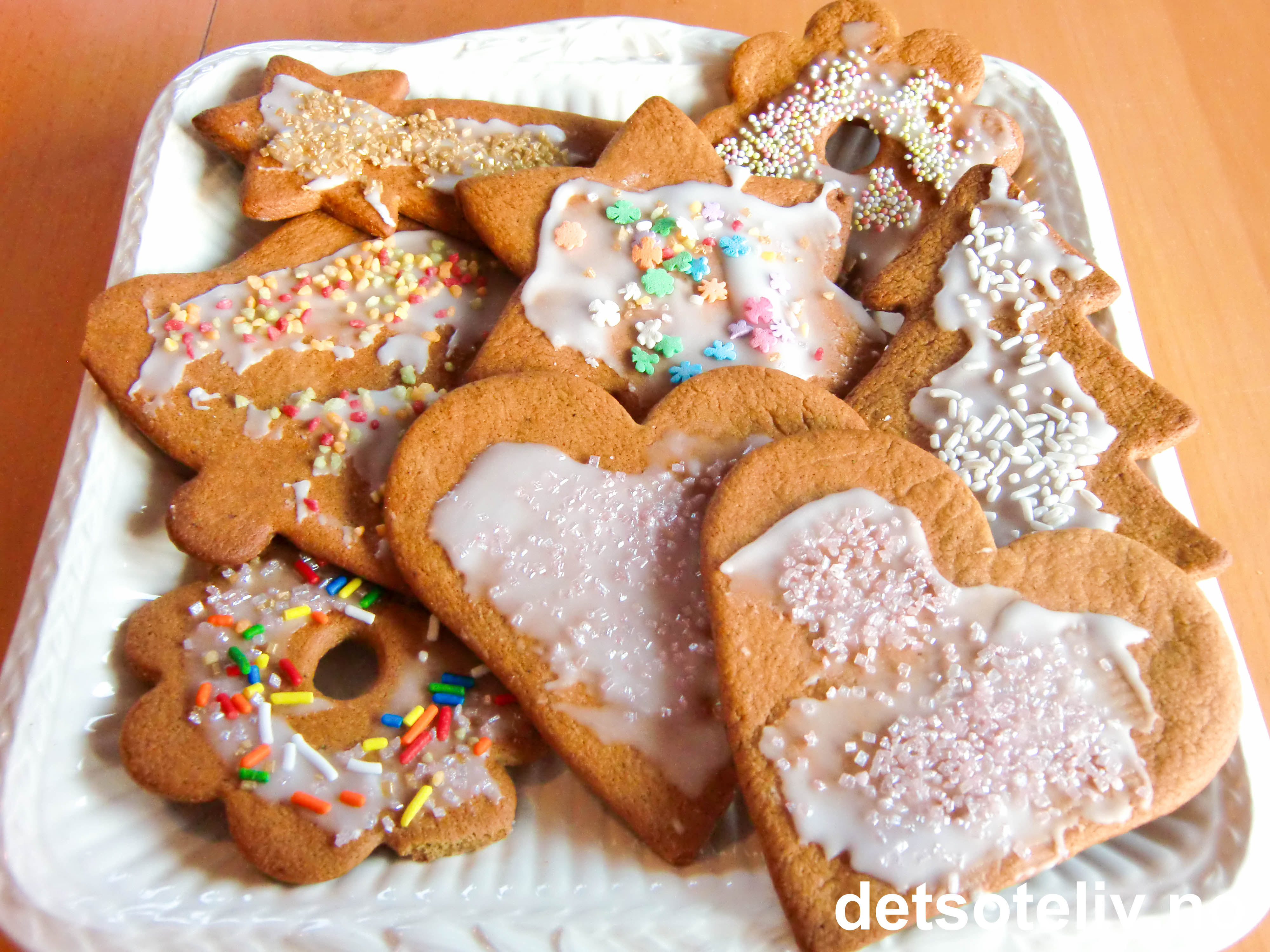 Pynt gjerne de kalde pepperkakene med tynt lag melisglasur (rør sammen melis og litt vann) og forskjellige typer kakestrøssel.