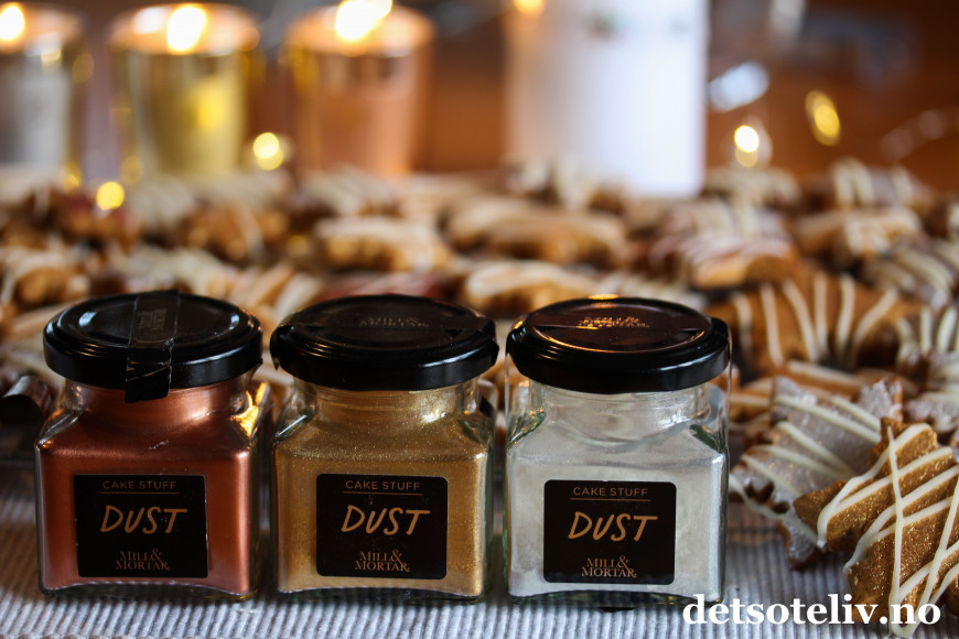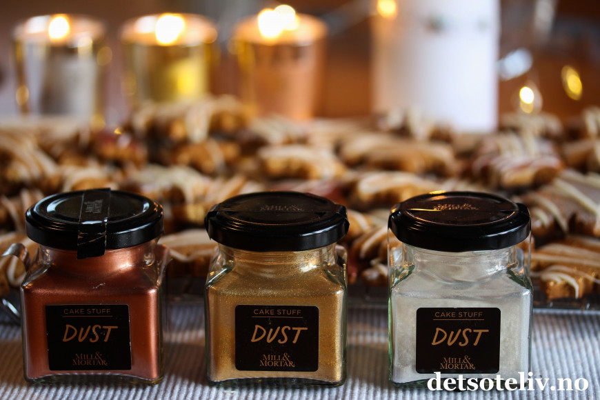 Glitteret finnes i gull, sølv og bronse, og kalles kakestøv (Cake Dust), og er fra danske Mill & Mortar.