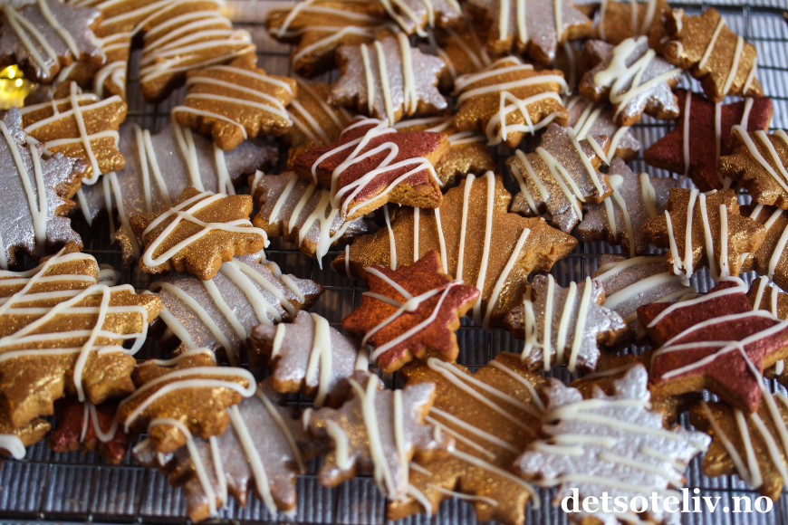 ♥ Når du lager melisglasur med eggehvite, stivner den etter hvert (i motsetning til om du lager den med bare melis og vann). Det går derfor fint å legge pepperkakene i en kakeboks når glasuren har stivnet. Gidder du ikke å lage hjemmelaget melisglasur, går det selvsagt greit å bruke ferdigkjøpt som også stivner etter at kakene har stått og tørket en stund.