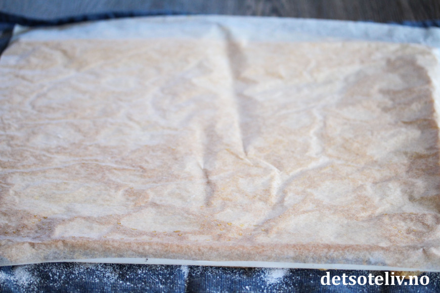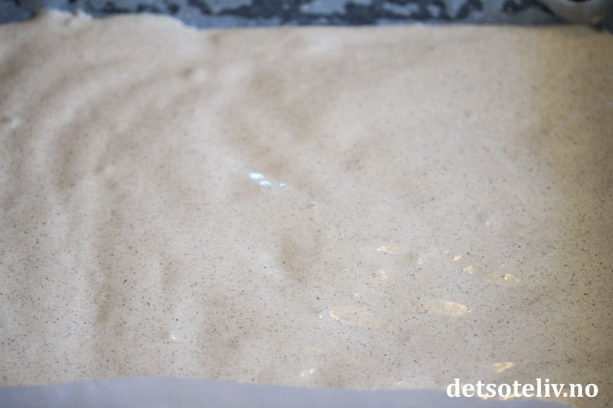 Bre deigen jevnt utover i en stor, bakepapirkledd langpanne (ca 30 x 40 cm).