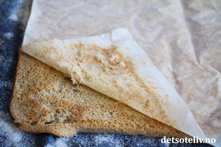 ♥ Hvis det er vanskelig å dra bakepapiret av kaken, kan det hjelpe å pensle over papiret med litt kaldt vann. Dra så forsiktig av papiret i smale strimler.