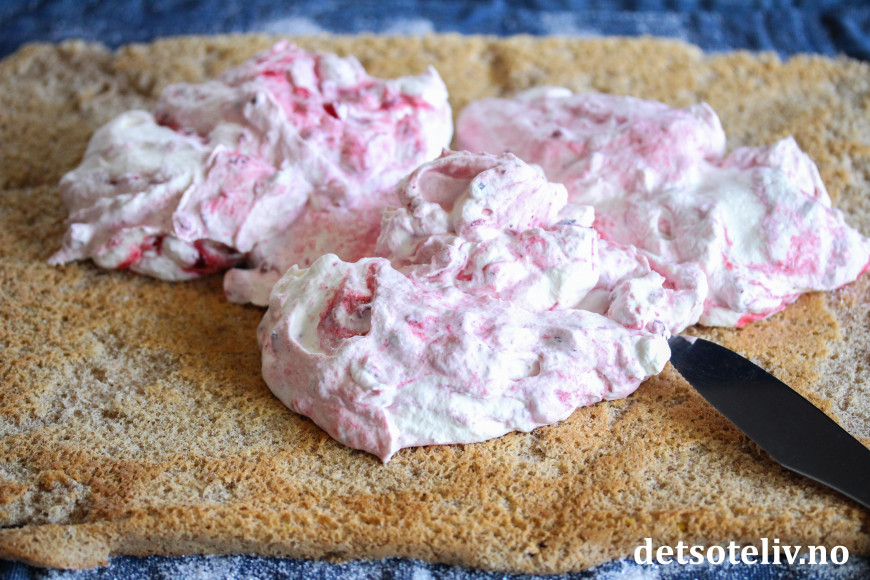 Bre tyttebærkremen over den kalde kaken. Rull sammen kaken fra langsiden. Renskjær kantene og flytt kaken forsiktig over på et avlangt fat.