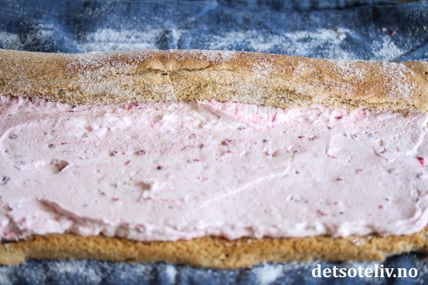 ♥ Kaken bør avkjøles med langpannen over, slik at den holder seg myk og blir lett å rulle sammen uten at den sprekker.