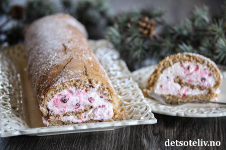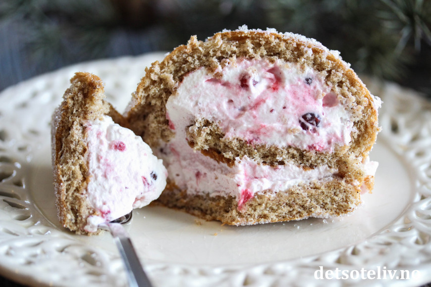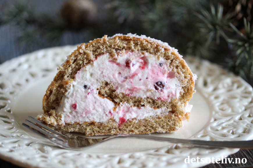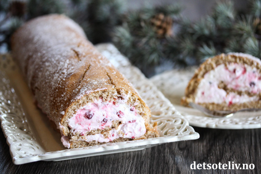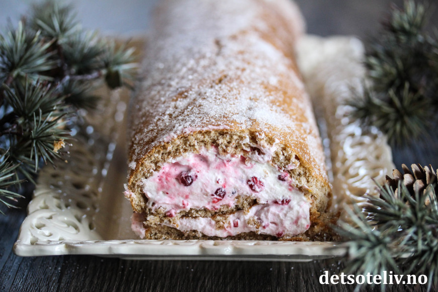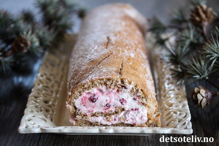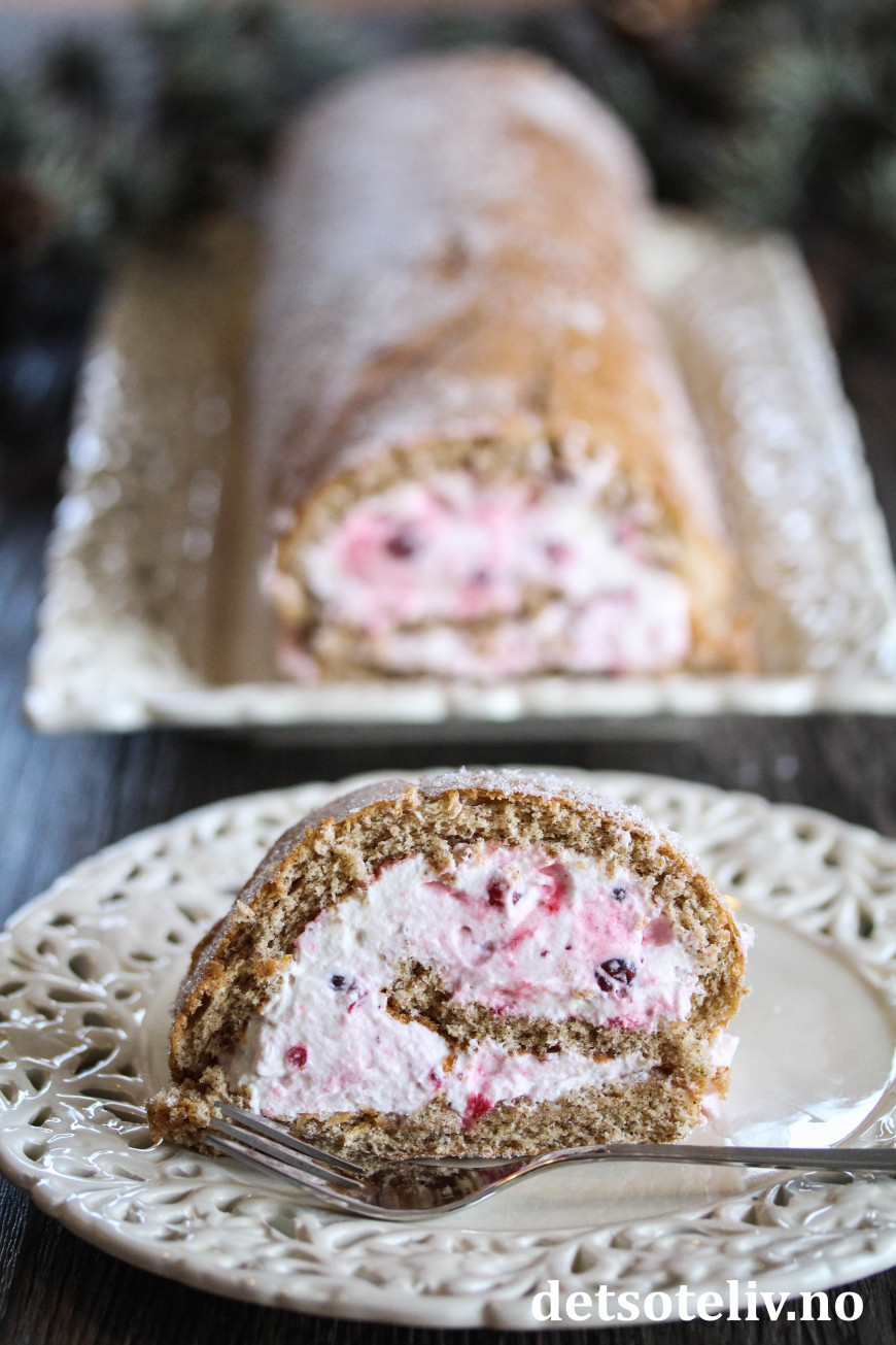 Dette er en nydelig rullekake med deilig kryddersmak og luftig tyttebærkrem!