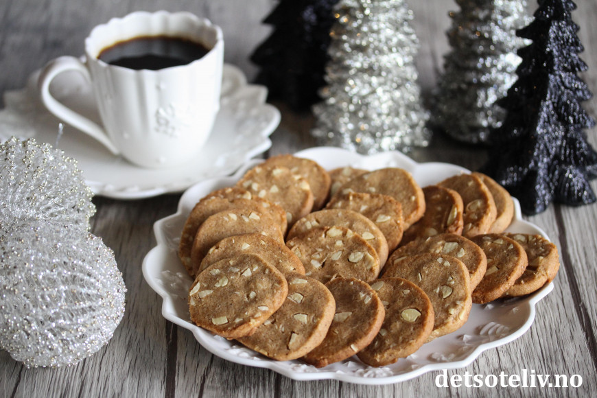 Pepperkakeskiver med mandler oppbevares i tettkakeboks, slik at de holder seg sprø.