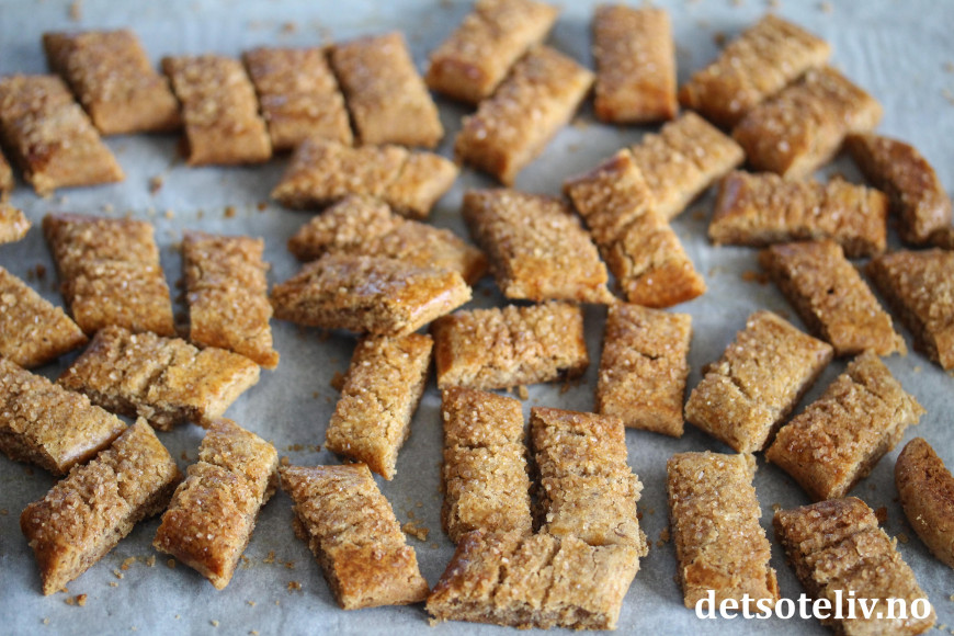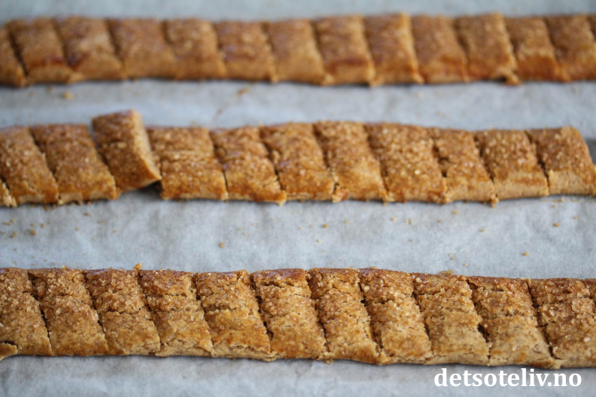 Ta platen ut av ovnen og skjær lengdene opp på skrå mens de fortsatt er varme. Dra snittene litt fra hverandre og la dem bli helt kalde på platen.