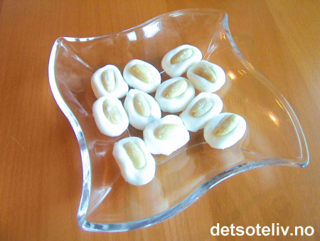 Trill ut små runde kuler. Kulene kan rulles i kakao eller dyppes i smeltet sjokolade. Eller de kan pyntes med en hel skåldet mandel som på bildet eller non-stop, mokkabønner eller annet som du liker.