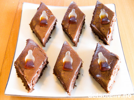 Avkjøl den stekte kaken i langpannen. Hvelv den så ut av formen og fjern bakepapiret. Smør den lunkne glasuren over kaken. Avkjøl kaken til glasuren har stivnet litt. Skjær kaken deretter opp i firkanter eller snipper, slik som på bildet. Pynt hvert kakestykke med en colaflaske eller annet godteri.