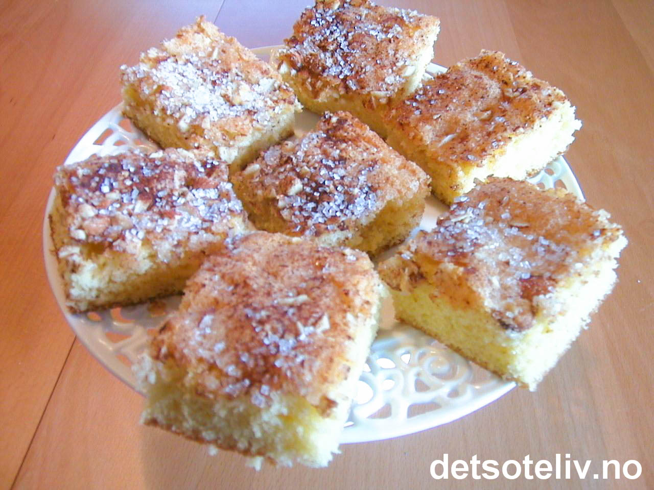 Kaken kan drysses med hakkede mandler i tillegg til perlesukker og kanel.