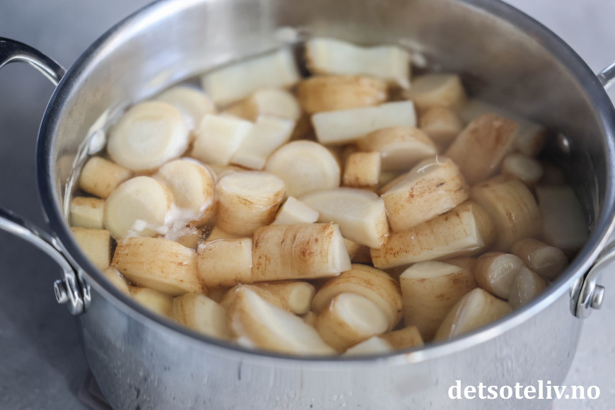 Skjær i mindre biter og ha i en kjele. Tilsett kokende vann og la småkoke i usaltet vann under lokk, til bitene er helt møre (ca. 15 minutter).