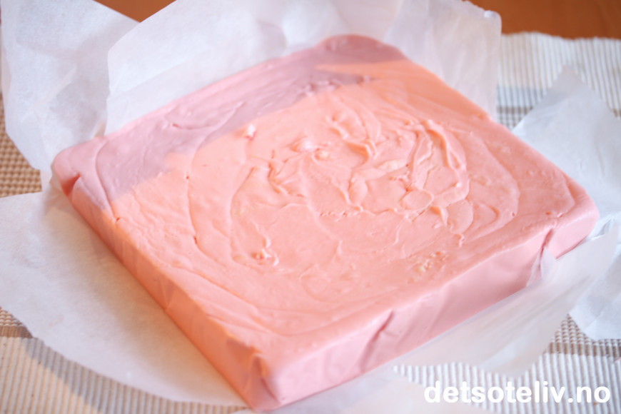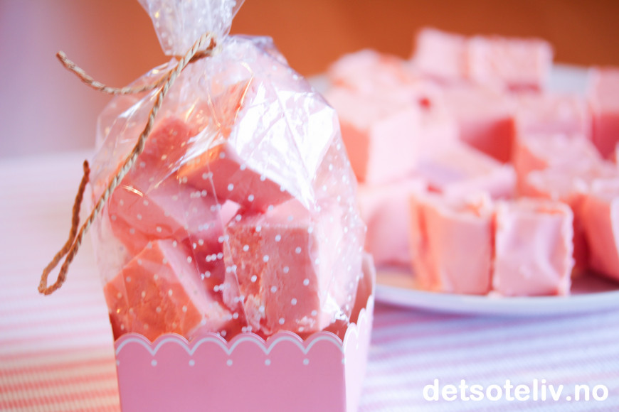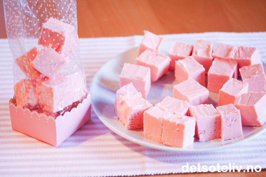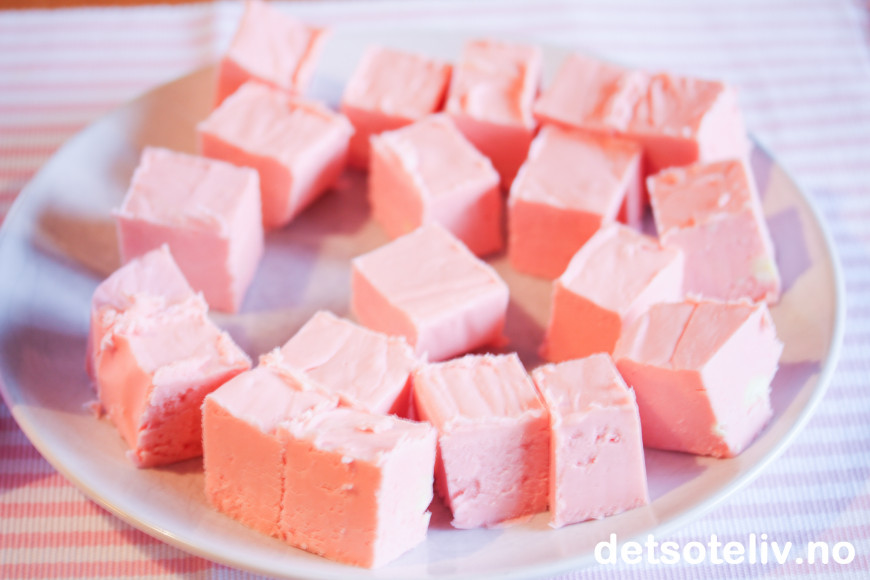 Jeg bruker rosa Marshmallow Fluff med jordbærsmak (se tips), som gir rosa farge og deilig godterismak på fudgen. I tillegg inneholder fugden hvit sjokolade og vikingmelk.