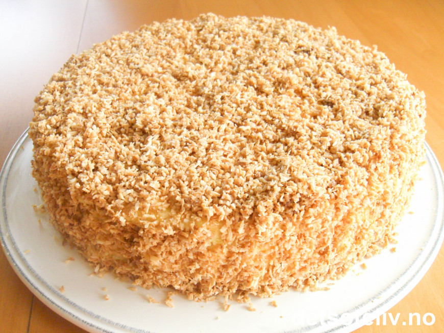 Det er tilsvarende viktig at den karamelliserte kokosen er helt avkjølt før den festes i kremen rundt kaken. Smør kremen rundt kaken rett før du strør over den avkjølte kokosen, ellers stivner kremen og kokosen fester seg ikke. For å feste kokosen langsmed sidene må du holde kakefatet litt på skrå og forsiktig drysse på kokosen og deretter trykke den fast med fingrene.