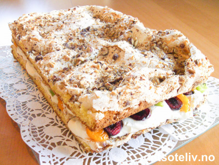 Sett den underste kakebunnen på et fat med marengssiden vendende opp. Fordel den piskede kremen over kaken. Legg på bær, halve moreller, oppdelt kiwi, mandarinbåter, eller det du måtte ønske. Legg på den andre kakebunnen. Oppbevar kaken kjølig frem til servering.
