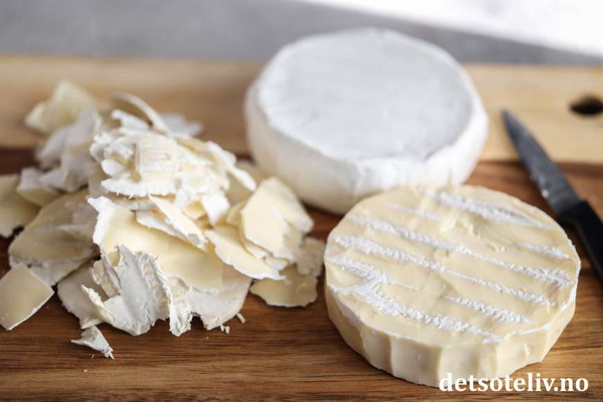 Bruk en liten, skarp kniv til å skjære bort hele den hvite skorpen rundt ostene. Ikke kast skorpen, se tips.