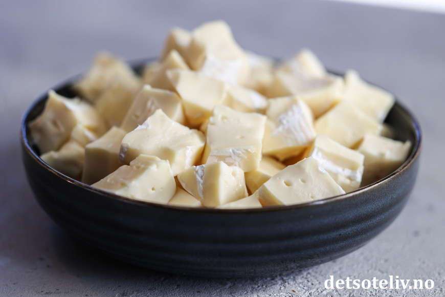 Skjær osten opp i terninger og ha dem i en skål. La stå i romtemperatur i ca. en halvtime, slik at osten blir skikkelig bløt.