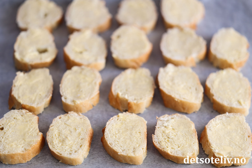 Skjær baguetten i ca. 1 cm tykke skiver og stryk over et lag smør. Legg skivene på en bakepapirdekket stekeplate.
