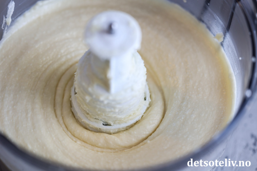 Kjør osten i food processoren til du får en tykk og fløyelsmyk krem. Dette tar noen minutter. Ostekremen vil være veldig stiv i starten, men bare fortsette å piske den videre i food processoren, så vil den etter hvert bli lysere, mykere og luftigere. Skrap ned osten på kantene innimellom, så alt blir pisket godt sammen.