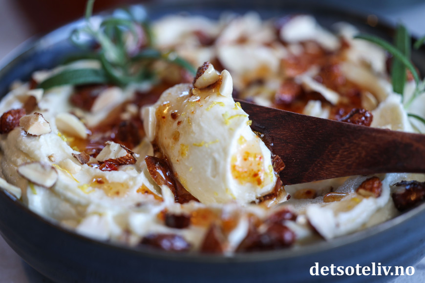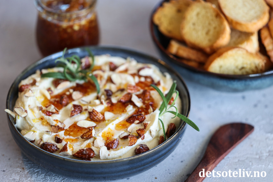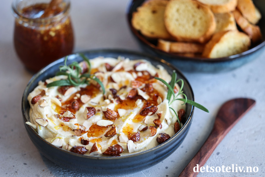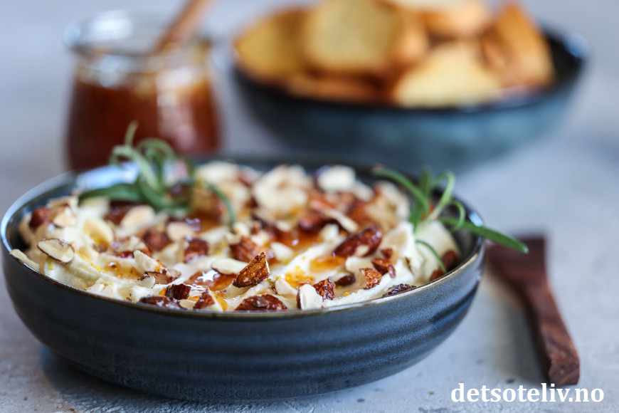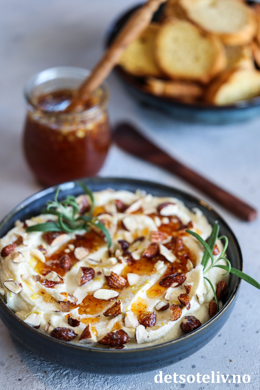 Grovhakk mandlene og dryss dem over ostekremen. Pynt med litt frisk rosmarin og hell til slutt over chilihonning.