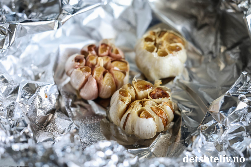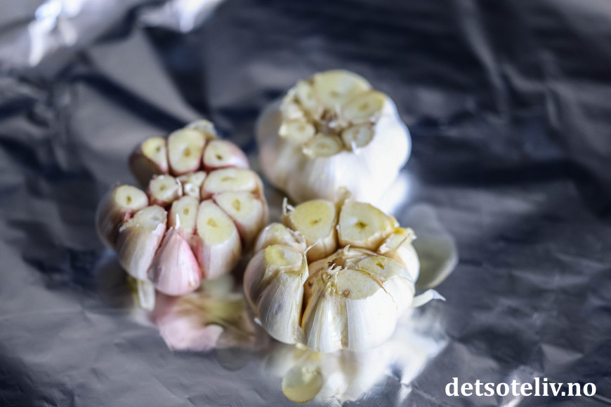 Pakk hvitløkene inn i folien. Sett dem på en stekeplate midt i ovnen og bak dem i ovnen ved 200°C i ca. 45 minutter.