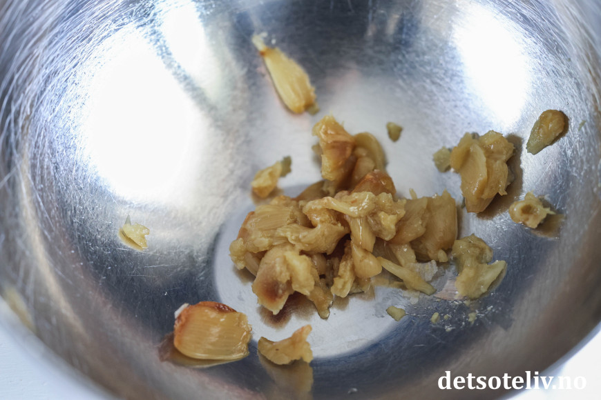 Ta de kalde, bakte hvitløkene ut av folien og klem på dem nederst, slik at de bløte hvitløksfeddene tyter ut på oversiden. Ha de bløte feddene i en skål og mos dem sammen med en gaffel.