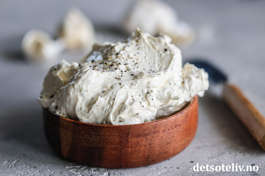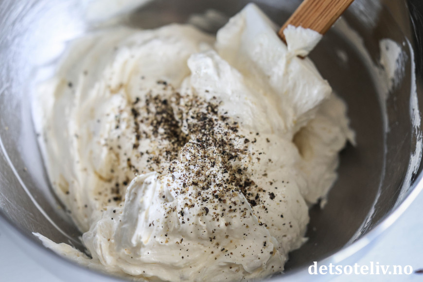 Fortsett med piskingen til smøret går fra å være gult til hvitt i fargen, og skikkelig luftig og kremete i konsistensen. Total pisketid pleier å være ca. 10 minutter, men bare fortsett å piske til du får den luftige konsistensen som du ønsker deg (det skjer ikke noe galt om du pisker smøret for lenge 😊 ). Smak til smøret med kvernet pepper.