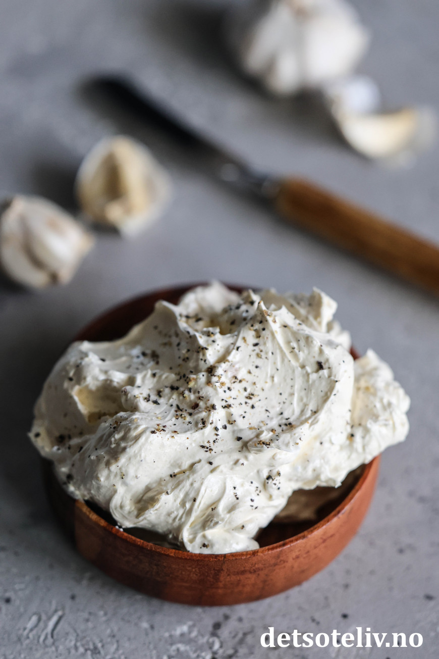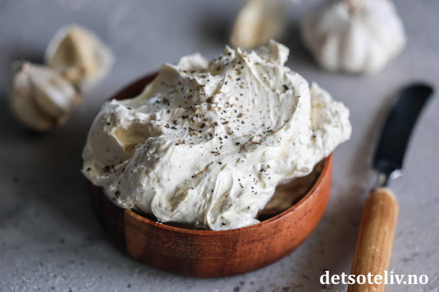 Jeg bruker tre hele hvitløk, men ikke la deg skremme av det. Det piskede smøret får likevel en mild hvitløkssmak! Når man baker hele hvitløk i ovnen, blir hvitløkssmaken nemlig helt forvandlet og blir nærmest søtlig og veldig mild. Hvitløkene blir dessuten helt bløte i konsistensen, slik at man kan klemme ut feddene og røre dem sammen til en hvitløksmos. Den bakte hvitløksmosen piskes sammen med smøret slik at du får et himmelsk godt og luftig hvitløkssmør.