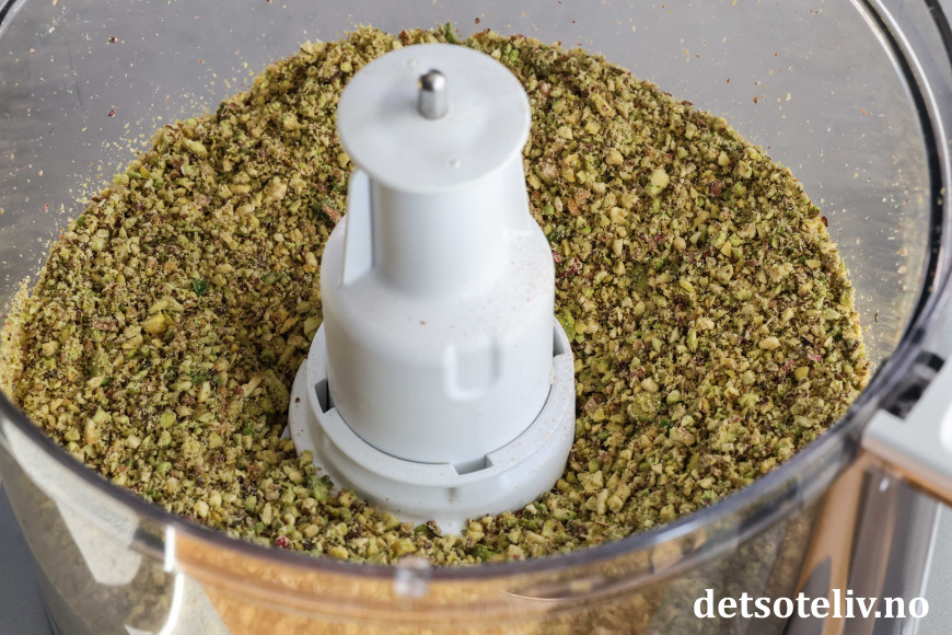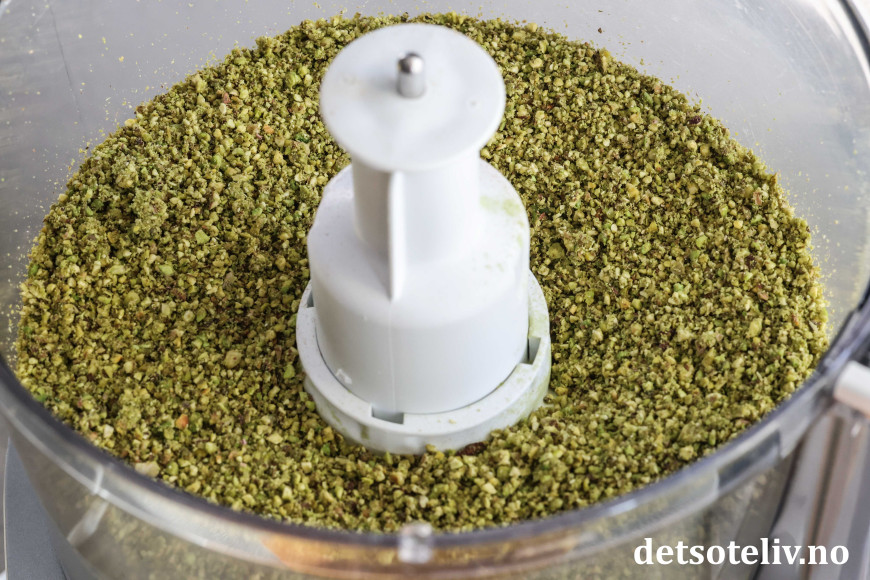 Kvern pistasjnøttene i en food processor til de blir finmalte.