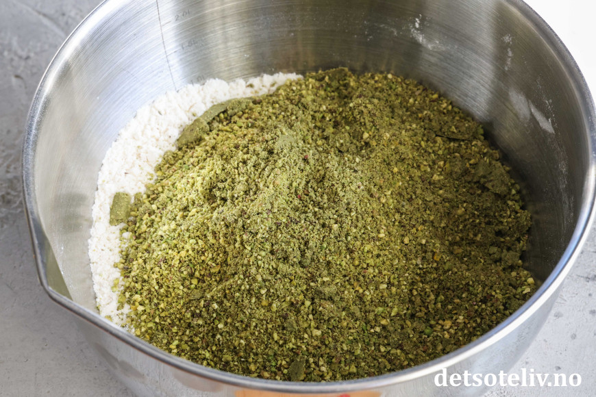 Kvern pistasjnøttene i en food processor til de blir finmalte. Tilsett matchapulver og kvern pulveret raskt sammen med nøttene slik at pulveret fordeler seg fint. Bland nøttene sammen med melet. Tilsett fint revet sitronskall og bland dette godt sammen med det tørre.