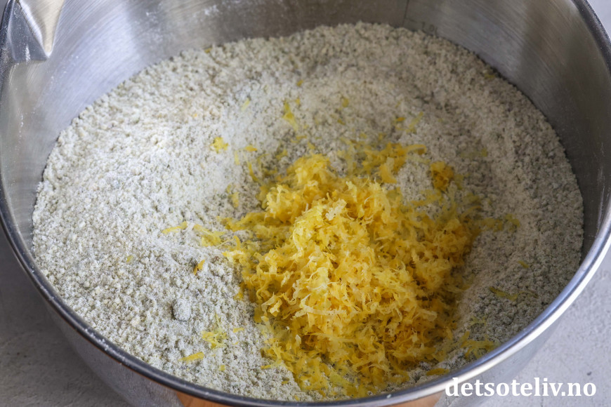 Tilsett fint revet sitronskall og bland dette godt sammen med det tørre.