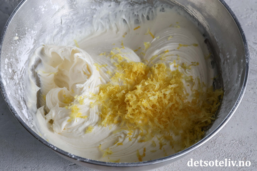 Pisk inn fint revet sitronskall til slutt.