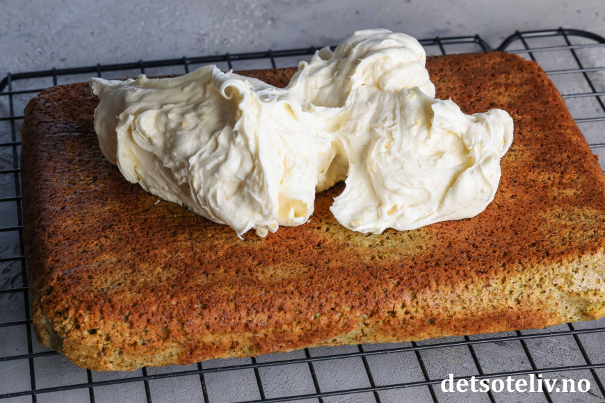 Hvelv den kalde kaken ut av langpannen og over på en rist. Dra av bakepapiret. Smør ostekremen over kaken i et tykt, jevnt lag.