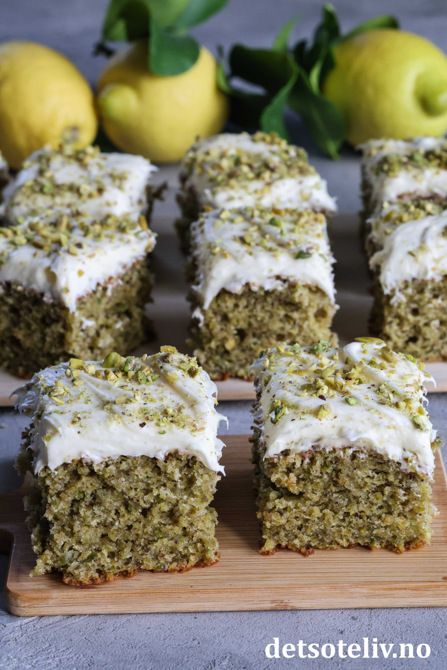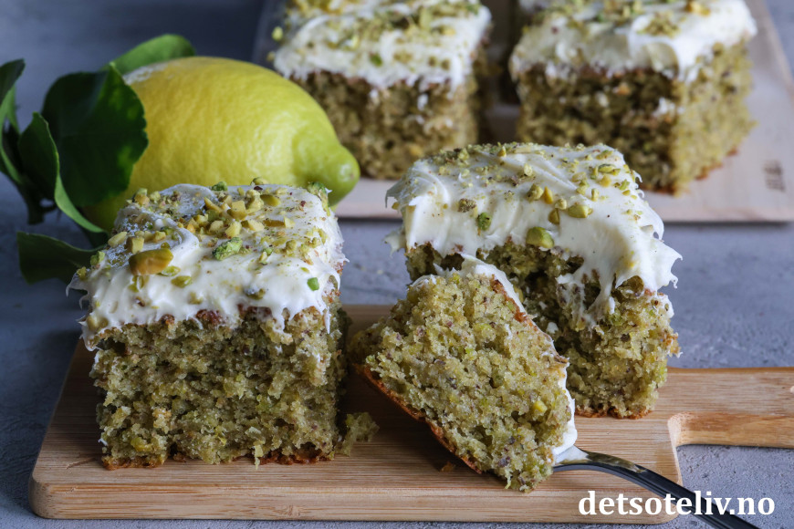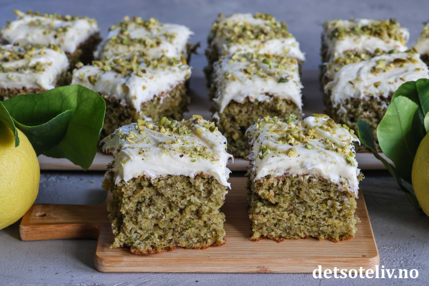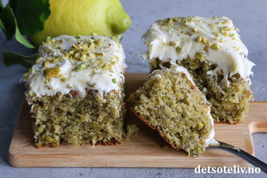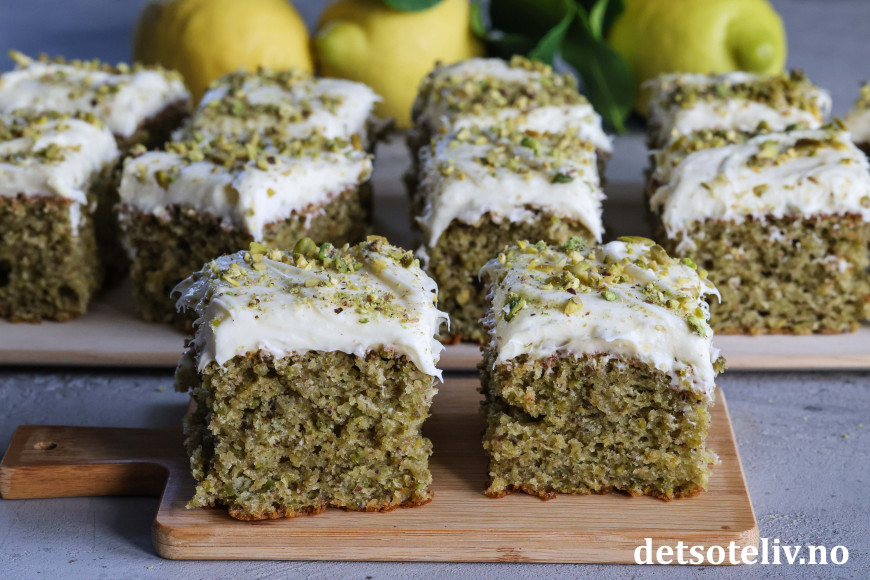 Kaken er supermyk og inneholder olivenolje, yoghurt, vanilje, revet sitronskall og masse malte pistasjnøtter. Litt matchapulver gjør at kaken får ekstra herlig grønnfarge. Kaken toppes med nydelig ostekrem smaksatt med både vanilje og sitron.