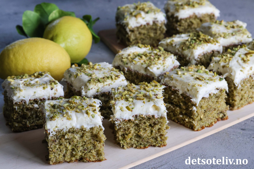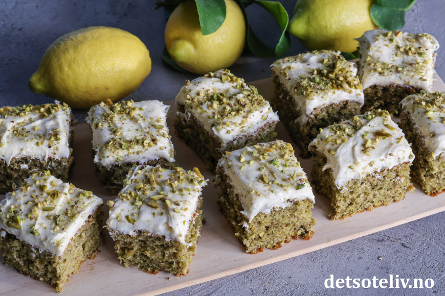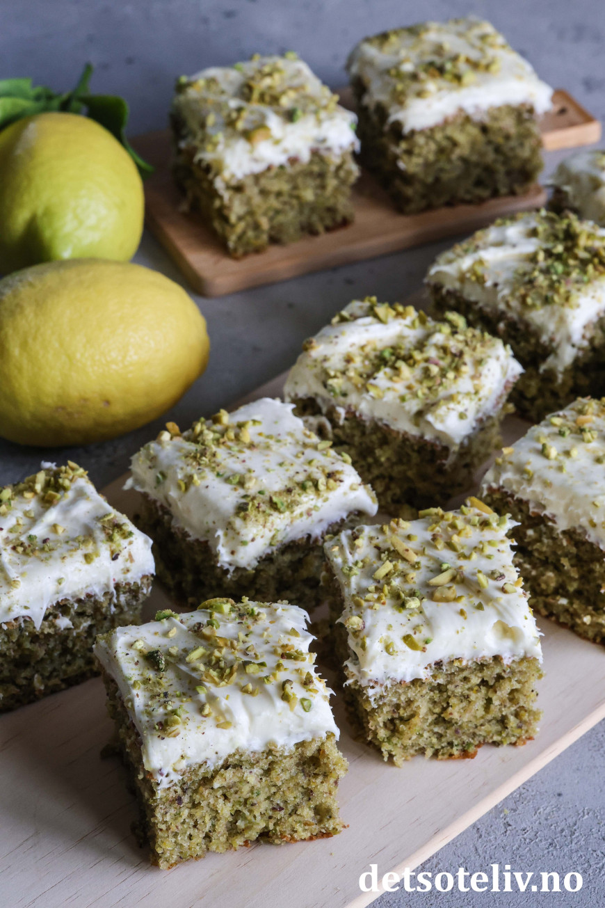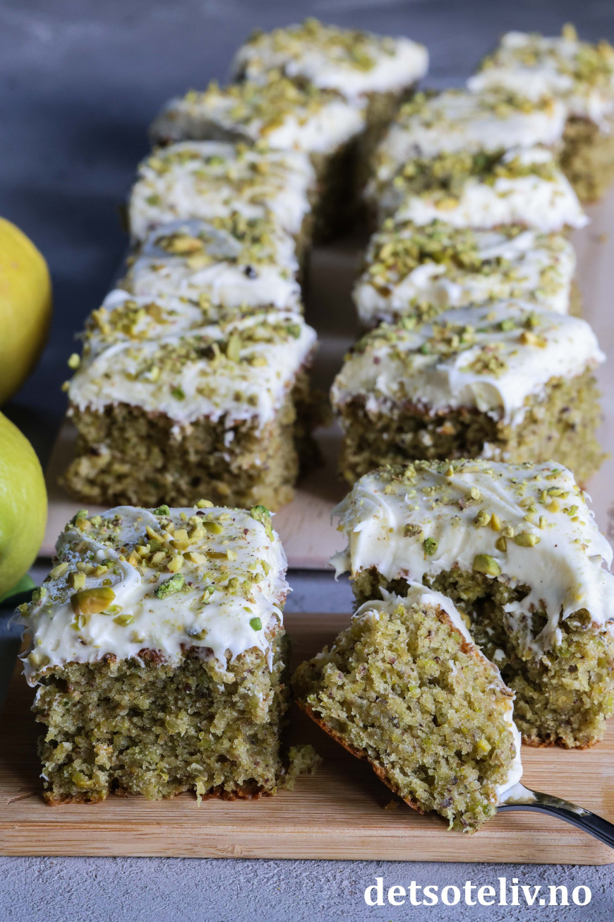 Kaken er supermyk og inneholder olivenolje, yoghurt, vanilje, revet sitronskall og masse malte pistasjnøtter. Litt matchapulver gjør at kaken får ekstra herlig grønnfarge. Kaken toppes med nydelig ostekrem smaksatt med både vanilje og sitron.