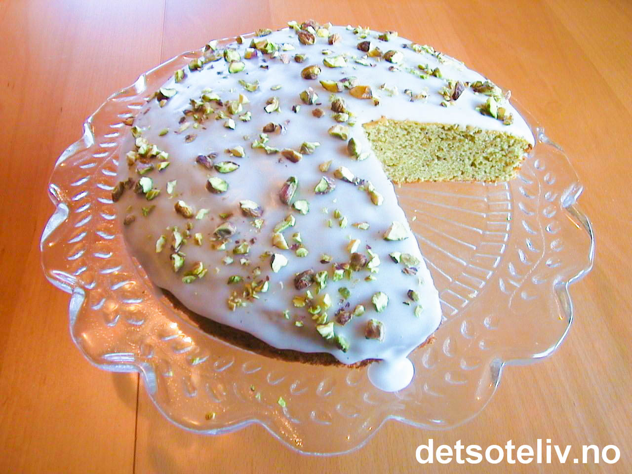 Avkjøl kaken i formen. Løsne kaken fra formen med en skarp kniv. Ta kaken ut av formen og fjern bakepapiret. Sett kaken på et passende fat. Rør sammen melisglasur og fordel jevnt over toppen av den kalde kaken. Pynt med hakkede pistasjnøtter. Sett kaken kaldt til melisglasuren har stivnet.