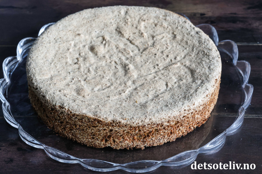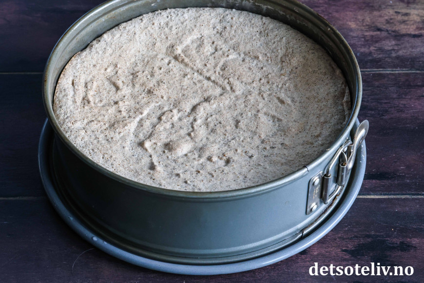 Ha deigen i en rund kakeform (24 cm i diameter) med bakepapir i bunnen.